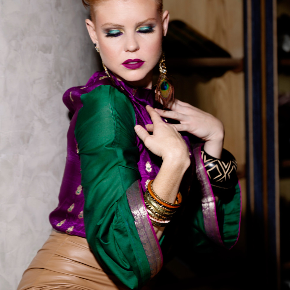 3. Step out in our high-waist leather short shorts worn with a bell-sleeve blouse for a soirée with the girls.